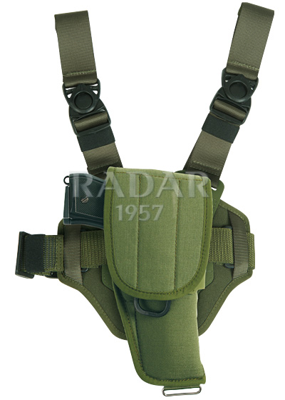 Chiusura di sicurezza con pattina asportabile, dotata di dispositivo di apertura silenziato ad elastico con tirante in plastica. Laccino di sicurezza regolabile, sganciabile con pollice in modo naturale. Dispositivo di estrazione rapida dell’arma con guida mirino