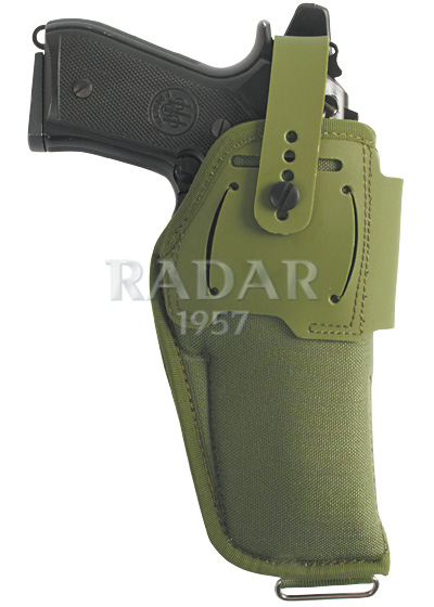 Portabilità da cintura, sia destra che sinistra, con molla in acciaio temperato e gomma balistica. Può adattarsi a 3 diversi tipi di utilizzo con o senza calcio coperto: da cintura, da coscia e ascellare.