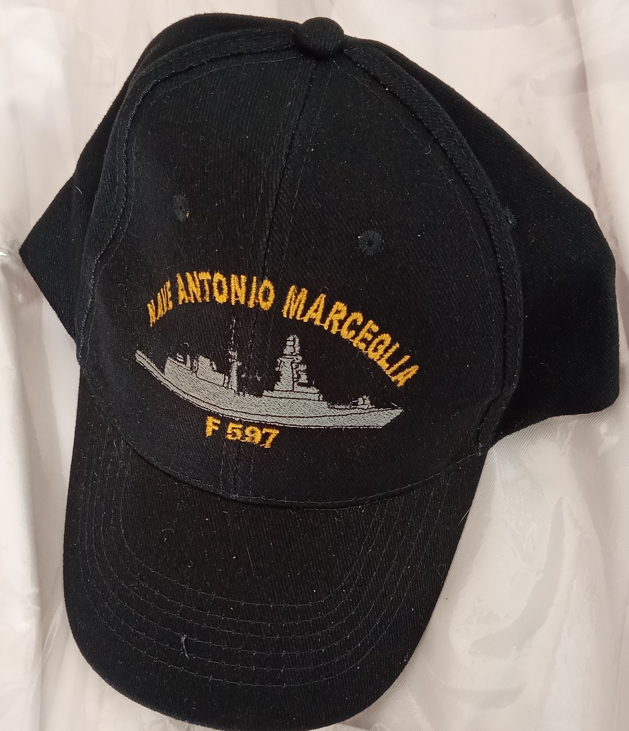 Berretto da navigazione tipo baseball di nave Marceglia, con ricamo frontale e chiusura posteriore a laccetto. personalizzazioni disponibili a richiesta, previo contatto telefonico o via mail