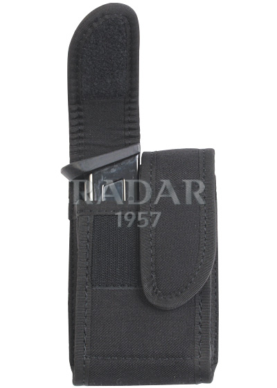 Porta due caricatori bifilare Multialyer non termoformato, dispositivo interno anticaduta in polimero, doppia applicazione in cintura, verticale e orizzontale, chiusura con doppia pattina e velcro.
