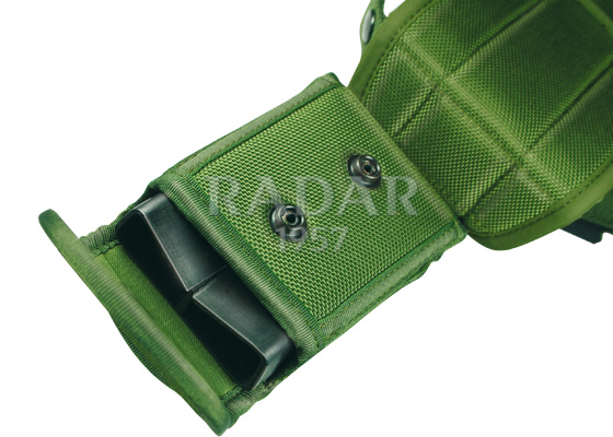 Porta due caricatori bifilare Nylon Tritech non termoformato, dispositivo interno anticaduta in polimero, doppia applicazione in cintura, verticale e orizzontale, chiusura con pattina e bottone a pressione con doppia posizione.