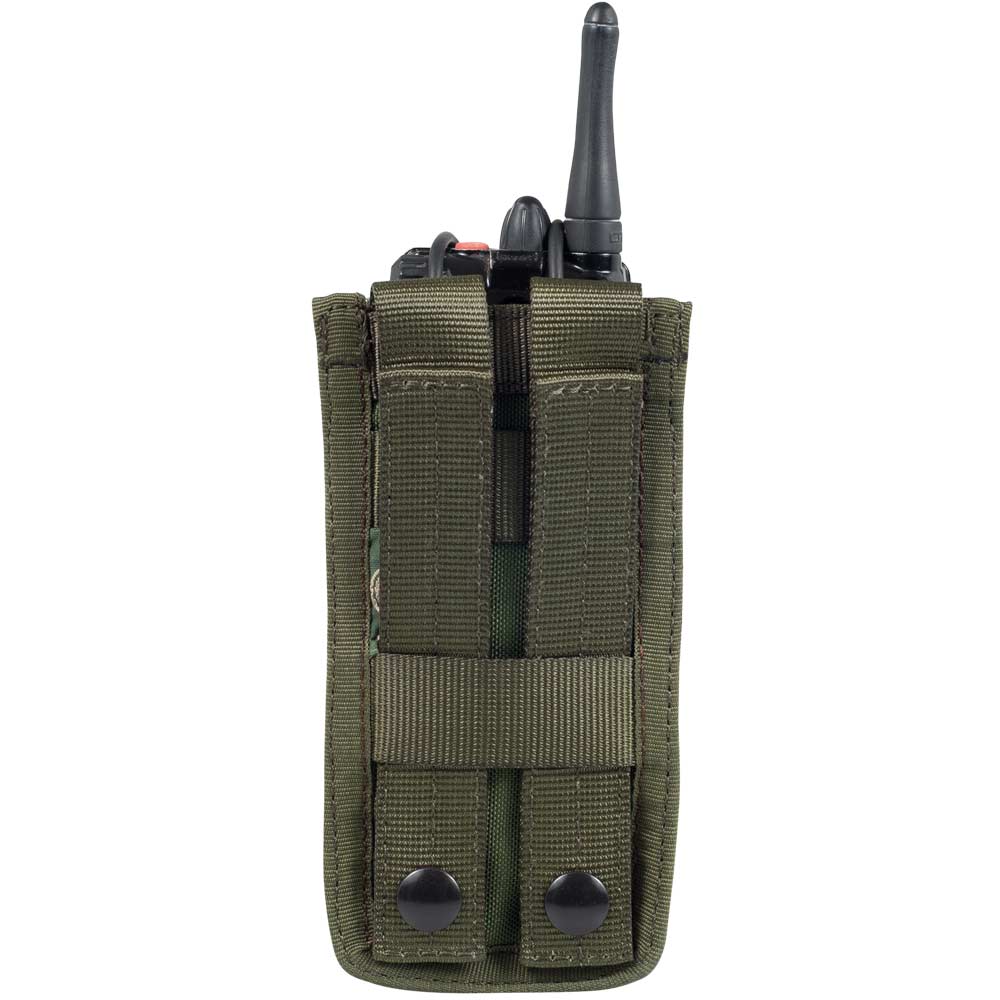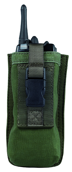 Porta Radio VHF universale con sistema interno di regolazione profondità, chiusura con o-ring elastico e fibbia a sgancio rapido in polimero e sistema MOLLE / CYC con bottoni a pressione.